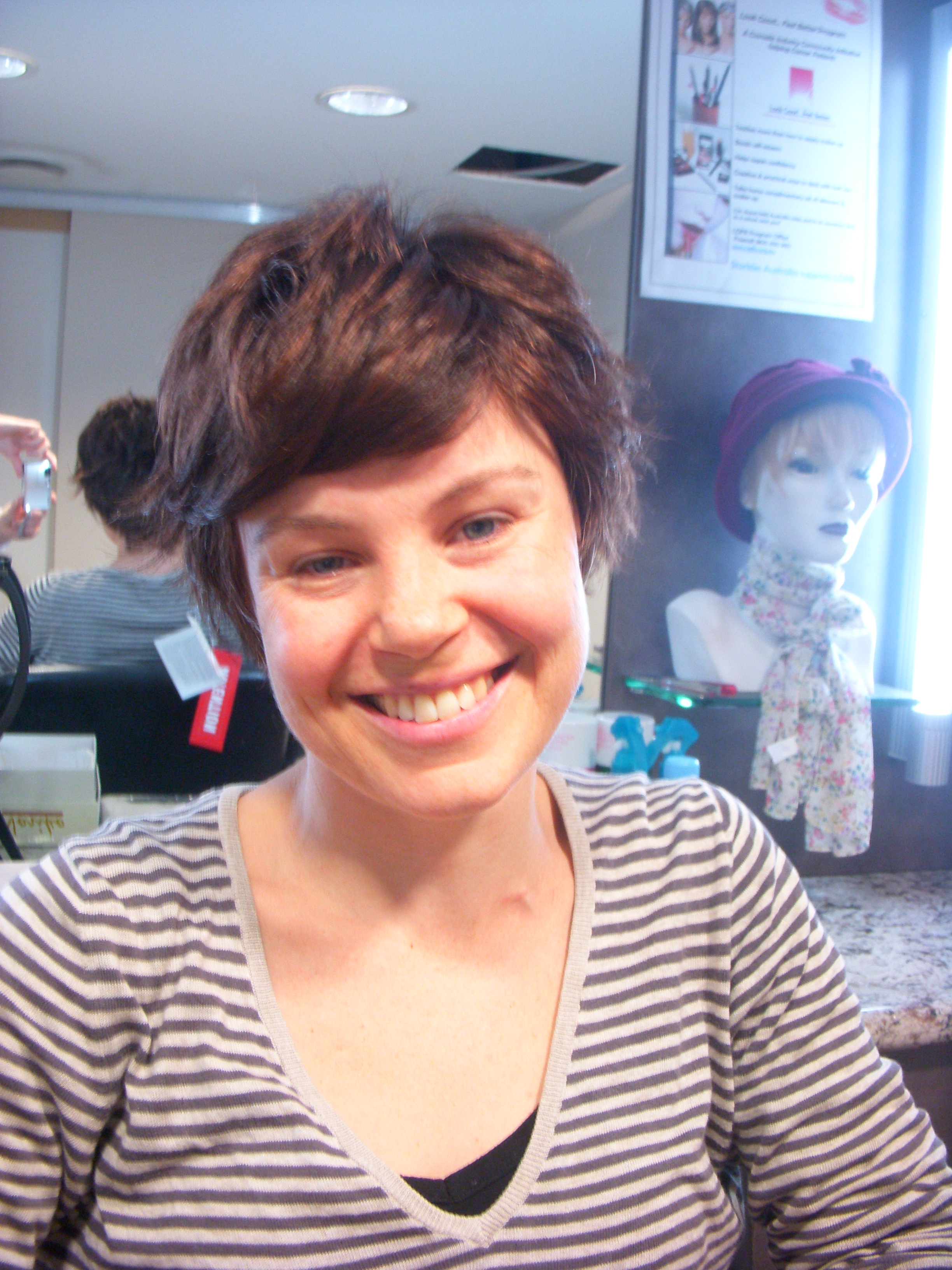 Sophie and I tried on the wigs for loan from the cancer council – I don’t think so. I either resembled an eighties failed rock star or a boofy Marge Simpson depending on the wig. However, the service is a good one. Then we went to Starkles, a wig shop, where I tried on all manner of dos. It felt like I had a synthetic animal on my head. We ended up picking one called ‘Tiana’ (the last two pictures). It’ll pass for real hair at a glance and when I don’t want to wear the beanie I can wear the wig (the cancer council does its rebate first, then I pay the difference).